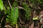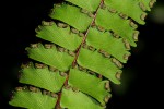 Rhizome short, erect, up to 10 mm in diameter; rhizome scales brown, c. 4 mm in length. Fronds tufted, membranous to firmly herbaceous, arching. Stipe up to 8 cm long, dark brown to black, shiny, with numerous reddish brown hairs and long, linear, brown scales. Lamina pinnate, linear-lanceolate in outline;10-40 × 2-4 cm, excluding a glabrous extension of the rhachis of varying length, which often ends in a proliferous bud or lamina with a terminal pinna. Rhachis and pinnae thinly set with pale hairs. Pinnae numerous (up to 40 pairs), persistent, subrectangular, shortly petiolate or sessile, alternate; 10-22 × 6-10 mm, reduced in size towards the base and apex, the midrib forms the lower margin, outer margin irregularly incised into lobes. Sori on the undersurface of deflexed, membranous, oblong to lunate, glabrous or thinly hairy indusial flaps. |