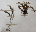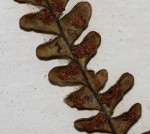 Rhizome creeping, c. 2 mm thick; scales grey-brown, lanceolate, entire, up to 2 mm long. Fronds spaced apart, erect, pinnatifid, sub-coriaceous to coriaceous. Stipe light-brown to black, up to 6 cm long, scattered with minute, pale brown scales, very narrowly winged. Lamina up to 17 × 1.7 cm, narrowly linear-elliptic in outline, glabrous, decrescent below, pinnatifid to the midrib into entire rounded oblong to quadrate lobes; midrib black, venation obscure. Sori 1-4 per lobe, intramarginal, set with castaneous hair-like paraphyses, exindusiate. |