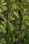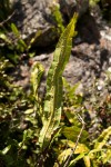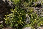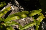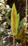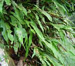 Rhizome long creeping, up to 4 mm in diameter, scandent, branched; rhizome scales appressed, shiny, lanceolate, up to 7 mm long, with a dark brown central stripe and paler ciliate margins. Roots thin, wiry, singly below each old frond. Fronds widely spaced on rhizome or on short side branches, erect to arching, deciduous, simple. Stipe articulated near the base, up to 6 cm long, covered with scattered scales similar to, but smaller than those on the rhizome. Lamina 14-33 × 1.5-6.5 cm, glabrous on both surfaces, thinly membranous (dry) to thinly coriaceous, linear lanceolate in outline, base wedge-shaped, apex abruptly ending in a tip, margin subentire, wavy; midrib prominent below; veins obvious, simple, sometimes forked near the costa, finely parallel. Sori circular, up to 2.5 mm in diameter, in a irregular line on either side of the midrib, situated within the inner half of the lamina; indusium round to kidney-shaped, small, hairless, dark brown, entire. |