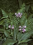 Robust terrestrial herb, up to 70 cm. Leaves 3-5, more or less in a basal rosette, large, up to 35 × 12 cm, lanceolate, plicate, dark green. Inflorescence densely many-flowered, peduncle slightly pubescent. Flowers white to purple; lip darker with an orange callus. Sepals lanceolate, acute, lateral sepals longer than the dorsal sepal. Petals elliptic to oblanceolate. Lip 3-lobed, side lobes small; mid lobe large, broadly obovate, notched at the apex. Spur 2-4 cm. |