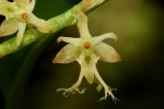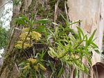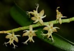 Robust epiphyte or lithophyte. Stems erect or pendent, up to 80 cm, normally unbranched. Leaves 2-lobed at the apex, variable in size and texture, depending on the habitat and exposure, usually thinly textured and flat in forest specimens, thickly leathery and folded along the length in woodland specimens. Inflorescences several to many, arising along the stem, each with up to 25 flowers. Flowers in two rows, all facing the same direction, buff-coloured, turning orange with age. Lip 3-lobed with the side lobes longer than mid-lobe and distinctly fimbriate at the apices. |