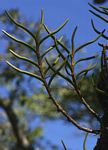 Erect or sometimes pendent epiphyte. Stems sometimes branching. Leaves borne on the apical half of the stem, terete, sometimes with a groove on the upper surface. Flowers in short inflorescences along the stem, axillary or on the old leaf nodes, pale green, turning apricot with age. Petals narrower than sepals; lip widening near the 3-lobed apex. Spur 6-18 mm, straight, slightly inflated in the apical half. The flowers are scented at night. |
