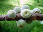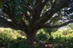 Large, spreading, briefly deciduous tree, usually starting as a strangler but often freestanding when older. Leaves elliptic to obovate, 14-43 cm long, thickly leathery, glossy green and hairless above, paler beneath with a few hairs on midrib and veins; veins often conspicuously yellow; base mostly rounded; margin entire, flat or slightly rolled under; petiole 3-13 cm long, silky hairy when young. Fruits sessile, usually in pairs in the leaf axils or on the old wood below the leaves, subglobose, 15-30 mm in diameter, densely hairy when young, yellow, reddish or brownish when ripe. |