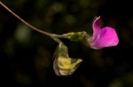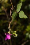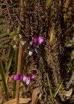 Climbing or prostrate herb, with annual stems 0.6–2.1 m long, more or less densely greyish hairy, growing from a perennial tuberous rootstock. Leaves 3-foliolate; leaflets ovate to slightly rhombic, 0.9–7.2 × 0.5–4.6 cm, sparsely to densely hairy on both surfaces, 3-veined from the base; petiole 1.5–5.8 cm long; petiolules 1–2 mm long; stipules ovate, 4–6 mm long; stipels lanceolate, 3–5 mm long. Inflorescences in axillary clusters or a short racemes on peduncles up to 9.8 cm long; pedicels 3–11 mm long; bracts 1–2 mm long; bracteoles 2–7 mm long. Calyx hairy; tube 3–4 mm long; lobes triangular, 1–6 mm long, upper pair fused along most or all of their length. Standard oblate, pink or magenta fading to bluish-purple, 10–18 mm long; wings purple; keel paler to white. Pods 4.2–7.8 cm long, almost hairless when mature, sometimes persistently velvety, 5–12-seeded. |