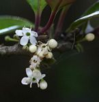 Medium sized evergreen tree. Leaves alternate, elliptic to lanceolate, dark green; margin entire or with scattered teeth in the apical half. Young branchlets and leaves distinctly purple tinged. Flowers in small dense axillary clusters, white, unisexual, sexes on different trees. Fruit a shiny round berry, red when ripe. |