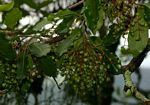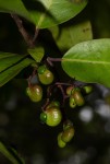 Small to medium-sized tree. Leaves spirally arranged, ovate-elliptic, usually c. 5 - 8 cm, glossy green above, paler and dull green below; midrib conspicuous, yellowish; margin entire, wavy or rolled under; petiole pink. Flowers in axillary or terminal panicles, white, fragrant. Fruit in branched, hanging clusters, flattened, black when ripe, with a bright red appendage making the fruits look kidney-shaped.