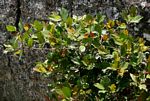Small evergreen tree. Leaves oblong or elliptic, thick and leathery, exuding a yellow sticky latex when broken. Lateral veins conspicuously etched on both surfaces. Flowers solitary or in small clusters, axillary, greenish-yellow, short-lived. Fruits fleshy, spherical, yellow when ripe, edible. |