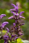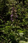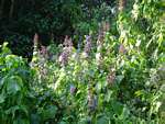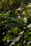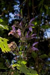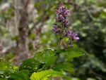 Soft-wooded aromatic shrub or even rarely a small tree, up to 5 m tall. Leaves opposite, more or less broadly ovate, sometimes purple-tinged, 10-40 cm long, often cordate at the base but lamina running back down into a winged petiole; margin coarsely toothed with small and large teeth. Flowers in a more or less open, branched purplish inflorescence, 10-40 cm long. Corolla pale to bright blue, mauve, violet or purple, 2 lipped; upper lip 25-52 mm long, covered with purplish glandular hairs; lower lip 17-40 mm long, 3-lobed. Capsule 25-45 mm long, glandular-hairy. |