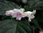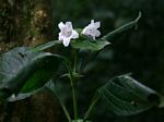 Erect or somewhat scrambling Shrub-like perennial herb, up to 2.5 m tall. Leaves opposite, largest 8-24 cm long, ovate to elliptic with a distinct drip-tip, dark green, hairy on both surfaces; petiole 2-6.5 cm long. Flowers in more or less condensed terminal racemose heads, white with purple-pink markings, softly hairy on the outside of the corolla. Capsule 11-14 mm long. |