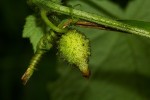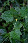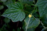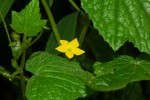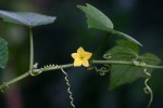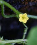 Prostrate creeper or climber with simple tendrils. Stems, petioles and tendrils with rough, backwardly pointed, bristly hairs. Leaves up to 10 × 9.5 cm, triangular, to broadly ovate in outline, unlobed or fairly shallowly 3(5) lobed, more or less densely covered in bristly hairs on both surfaces, especially on the veins; lobes usually triangular; margins with small sinuate teeth; petiole 2.5-11.5 cm long. Flowers unisexual on the same plant, up to 1-2 cm in diameter, pale yellow. Male flowers in 3-6-flowered axillary clusters. Female flowers solitary on pedicels 3-10 mm long; ovary densely bristly hairy. Fruit ovoid to ellipsoid, 1.5-2.7 cm long, tuberculate, usually with a short beak, green or yellow. |