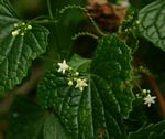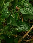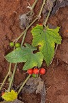 Prostrate or climbing herb with annual stems, up to 6 m long. Leaves more or less broadly ovate in outline, usually unlobed but occasionally 3-5-lobed, deep green and with rough hairs above, paler below, cordate at the base; margin prominently toothed. Flowers small, unisexual on different plants; male flowers in axillary clusters; female flowers solitary or in few-flowered clusters, white. Fruit in clusters, spherical, 8-13 mm in diameter, hairless, bright red when ripe. |